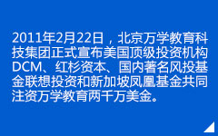 由于遥遥领先的高端技术和闪耀业界的卓越成就,2008年2月,万学教育第一次荣获全球最大创投基金红杉资本(GOOGLE、苹果电脑、甲骨文、雅虎等著名企业的投资方)和联想集团共同投资两千万美金。2011年2月,万学教育再次荣获美国顶级投资机构DCM、红杉资本、联想投资和新加坡凤凰基金联合投资两千万美金。世界四大投资基金对万学的巨额投资,旨在支持万学更有效的研发和提供针对大学生的各类高端教育服务。