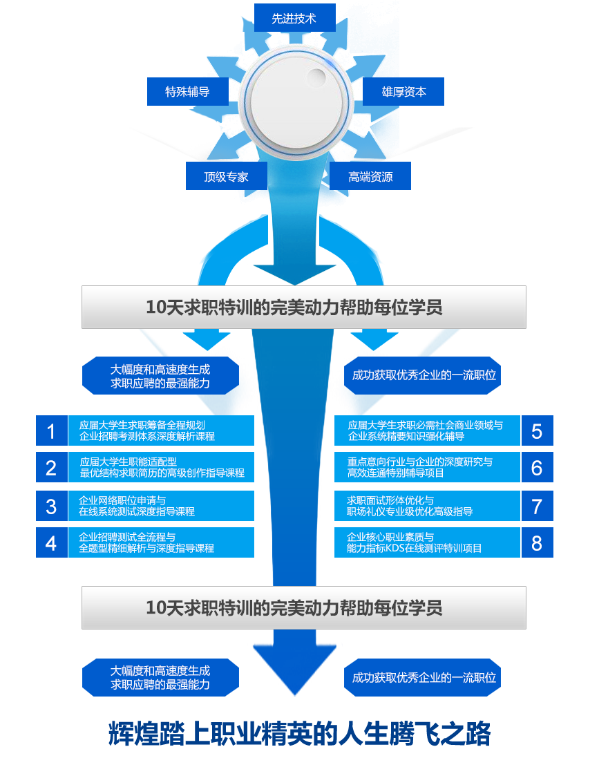 大学生求职竞争不仅极其激烈,异常复杂,而且这次竞争的结果将深远影响一个大学生的一生!所以万学教育集团历时四年投入高端技术、雄厚资源和巨额资本创造了代表中国最高水平和最优品质的ACT大学生职业能力课程体系,其中ACT求职超级特训项目,通过革命性的先进课程技术和特种训练模式,确保学员最大幅度和最高速度生成求职应聘的最强能力,从而成功获取优秀企业的上佳职位,辉煌踏上职业精英的人生腾飞之路!